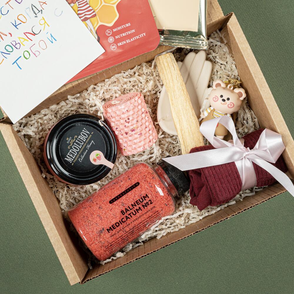 соль для ванной laboratorium – 1 шт.брелок для ключей – 1 шт.свеча из вощины – 1 шт.Мед-суфле – 1 шт.носочки универсального размера – 1 шт.благовоние пало санто – 1 шт.подставка-ладошка для благовоний из гипсофила – 1 шт.чай кантата – 1 шт.тканевая маска для лица – 1 шт.