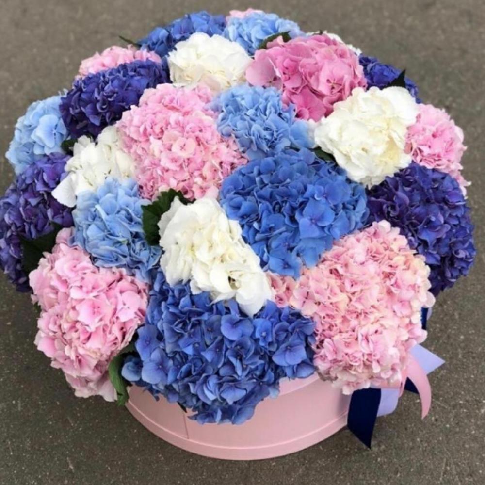 39 гортензий микс в шляпной коробке
