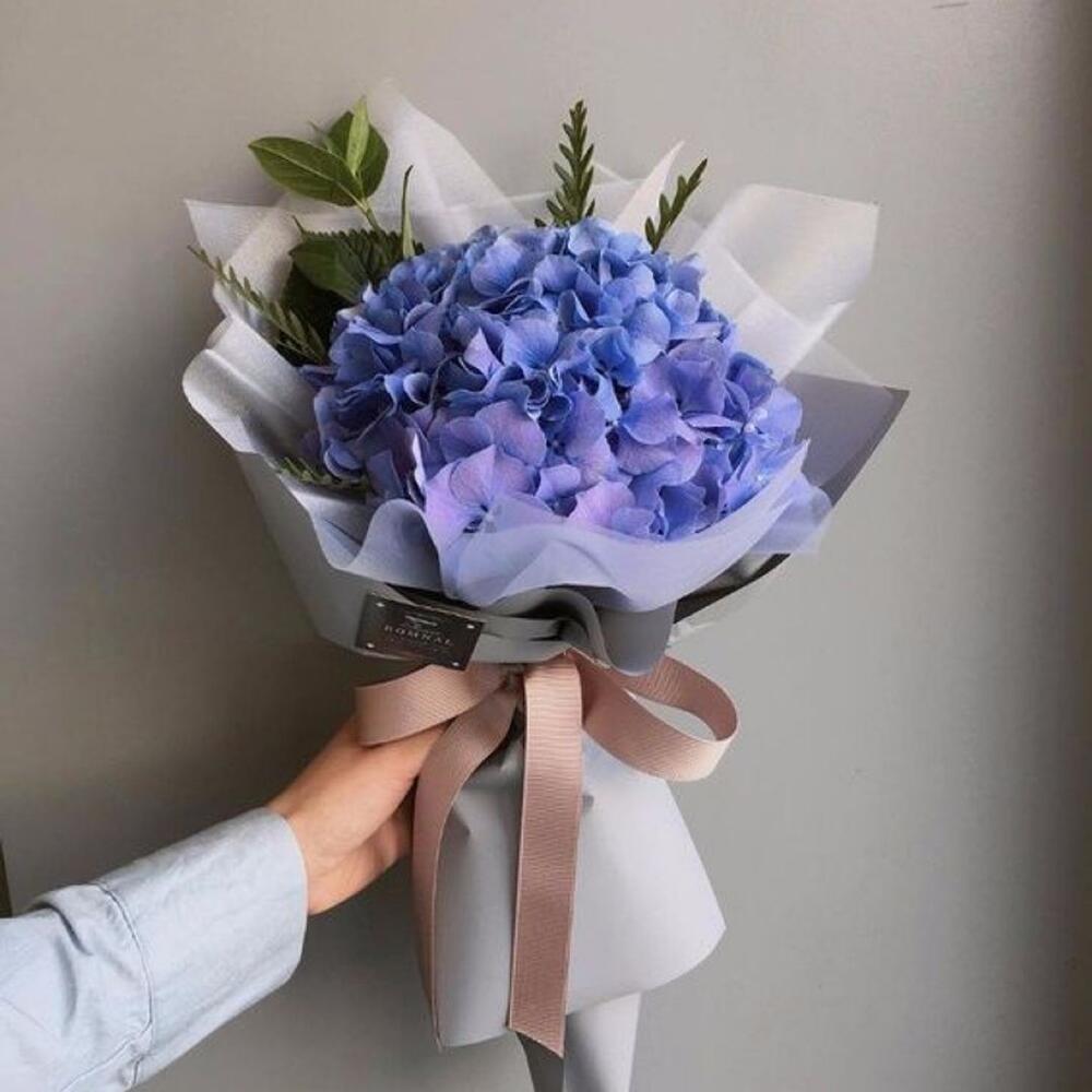 Букет с гортензией такого цвета-отличный вариант подарка. Цветок такой расцветки красиво засыхает, а не увядает, из-за чего остаётся сухоцветом в интерьере сейчас у гортензий самый сезон, они в самом соку