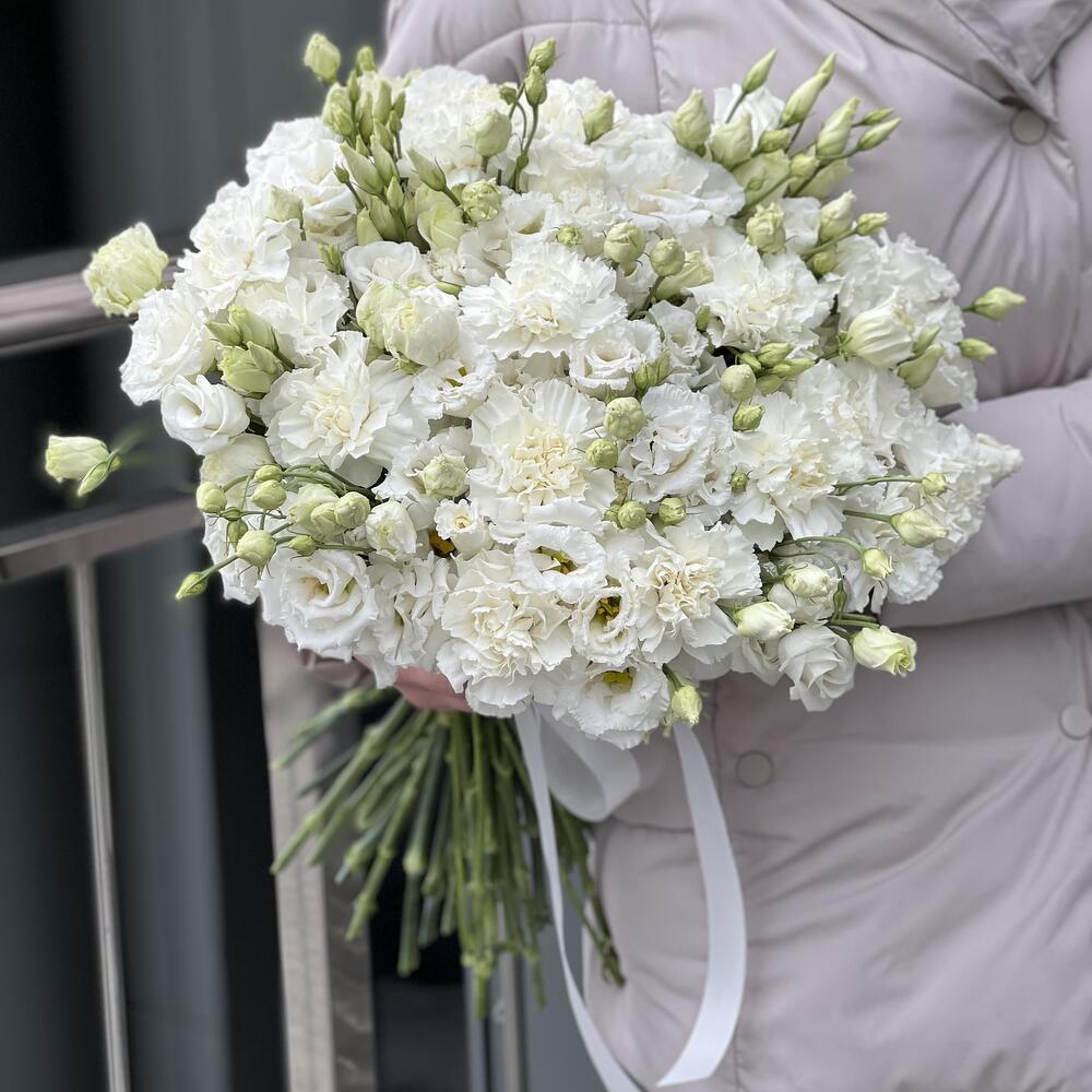 Букет оформленный под ленту из белых гвоздик и кружевной эустомы!