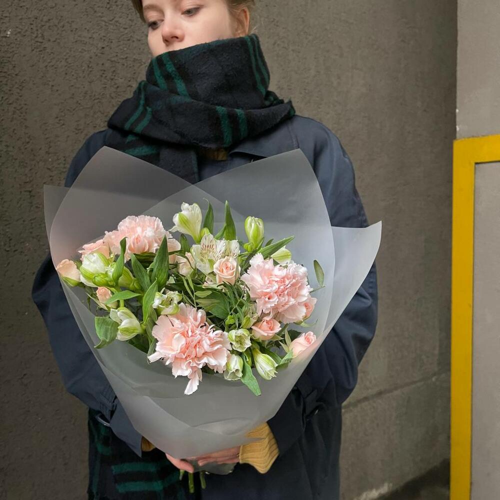 Альстромерия белая – 3 шт.Фисташка – 2 шт.Диантус розовый – 3 шт.роза кустовая персиковая (40 см) – 3 шт.пленка матовая прозрачная (0 – 1 шт.