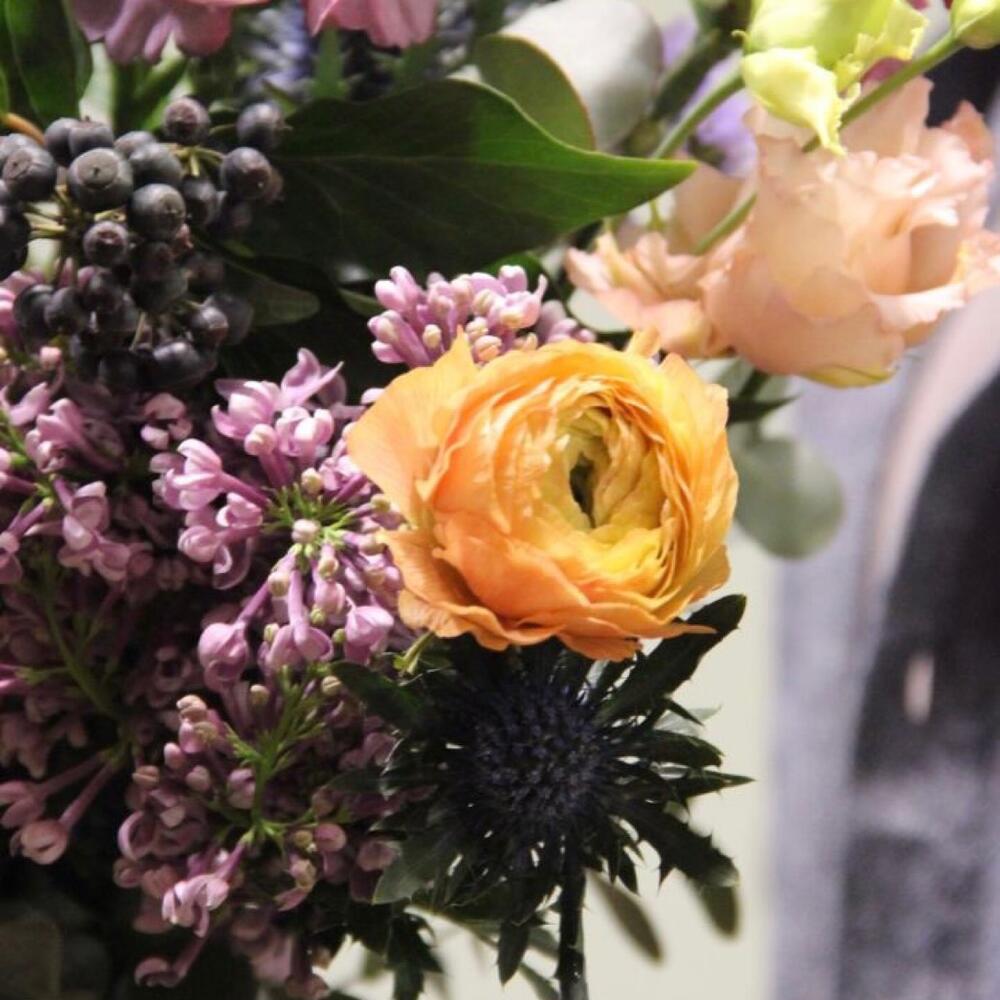 Ранункулюс – 5 шт.Тюльпан – 3 шт.Сирень – 2 шт.Гвоздика – 5 шт.Плющ – 2 шт.айва ветка – 1 шт.колючки ветка – 1 шт.Эвкалипт – 5 шт.Лизиантус – 2 шт.Лента – 1 шт.