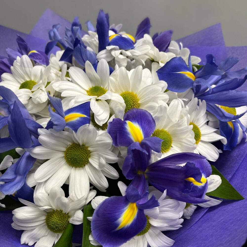 Ирис Blue Magic – 7 шт.Хризантема кустовая – 7 шт.Рускус – 3 шт.Фетр – 1 шт.