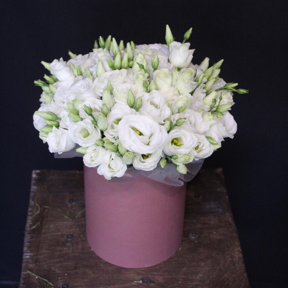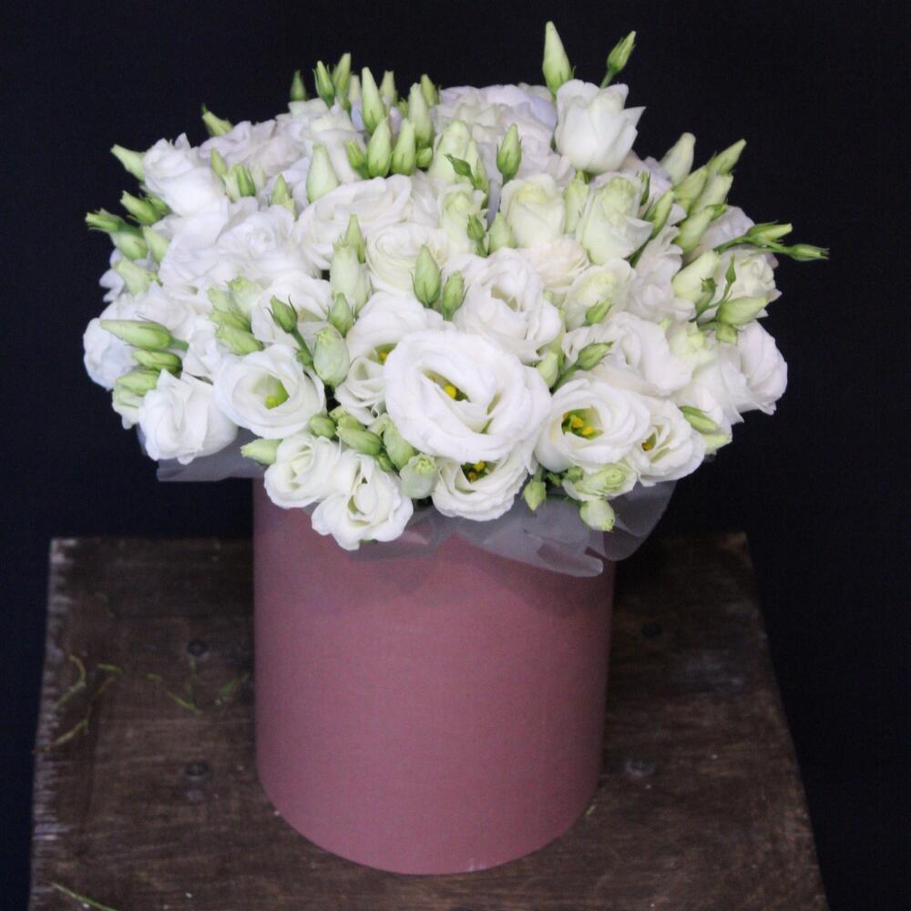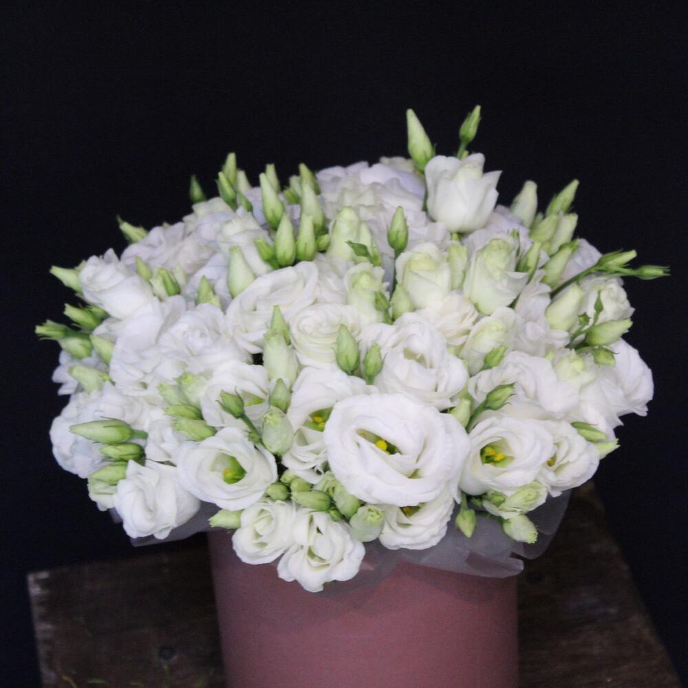 эустома белая – 9 шт.Оазис флористический – 1 шт.Пленка дизайнерская – 1 шт.Шляпная коробка – 1 шт.