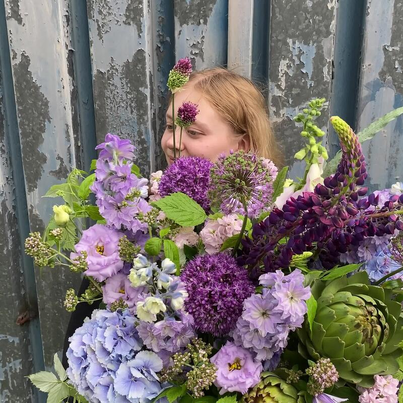 Артишок – 2 шт.Люпин – 3 шт.Дельфиниум – 5 шт.Клематис – 3 шт.Гортензия – 3 шт.Аллиум – 7 шт.Лизиантус – 5 шт.Колокольчик – 3 шт.Маттиола – 7 шт.Малина – 9 шт.Травы – 9 шт.Оазис флористический – 3 шт.Корзина – 1 шт.