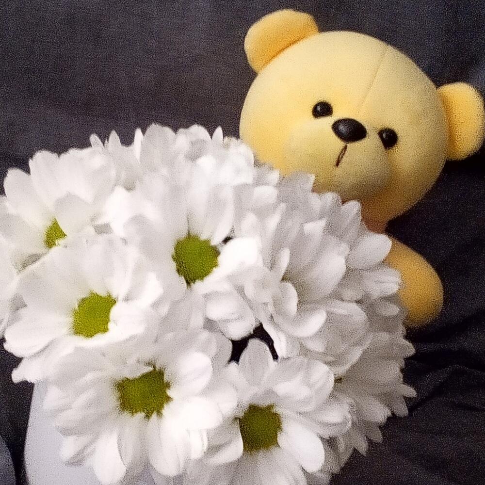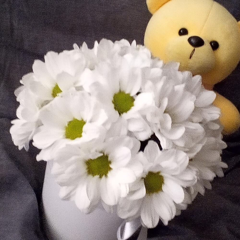 Ромашка – 17 шт.Мишка плюшевый – 1 шт.Флористическая губка – 1 шт.шляпная коробка 12х12 – 1 шт.