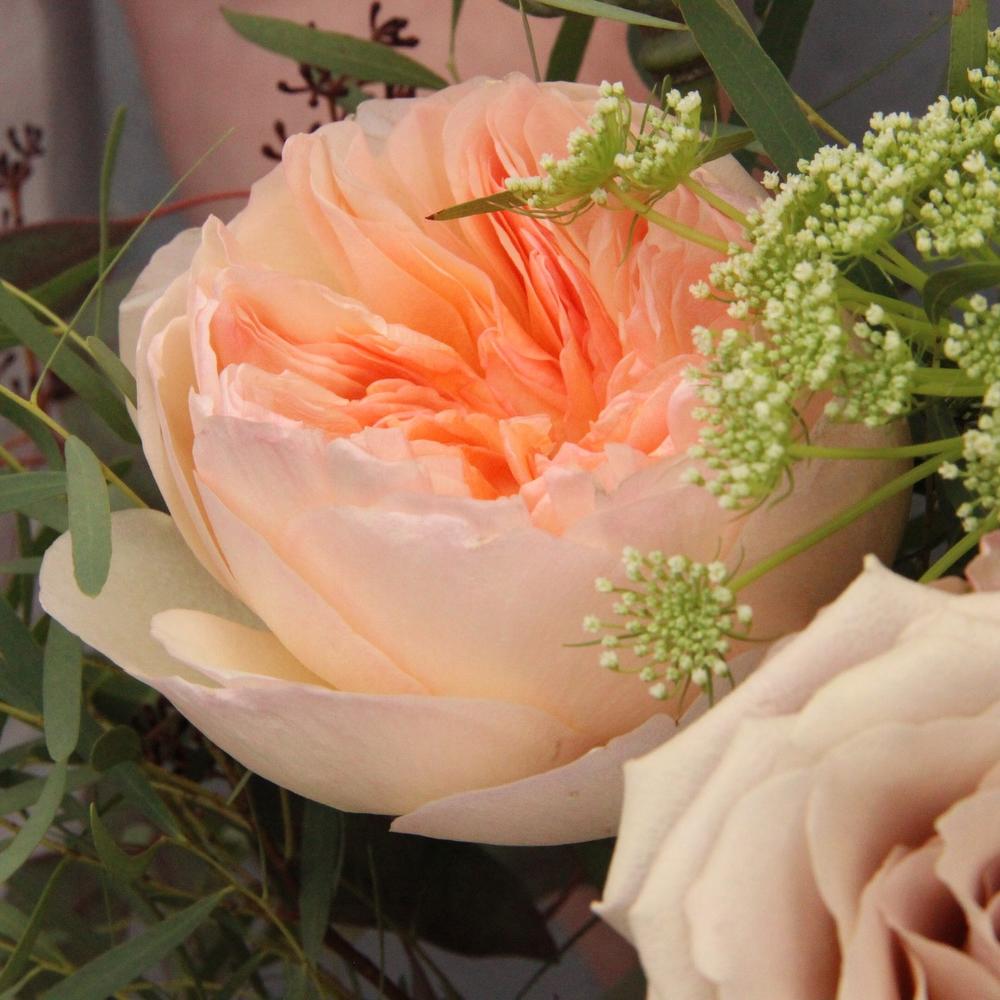 Георгина – 2 шт.Роза кустовая пионовидная – 1 шт.Роза пионовидная – 2 шт.Роза сортовая – 2 шт.Амми – 1 шт.Эвкалипт – 4 шт.фисташка зелень – 2 шт.Лента атласная – 1 шт.
