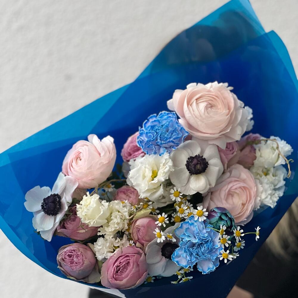 Анемон белый – 2 шт.Ранункулюс розовый – 3 шт.тюльпан крашенный – 1 шт.Диантус – 2 шт.Матрикария – 1 шт.Кустовая роза – 2 шт.Махровый лизиантус – 2 шт.Упаковка дизайнерская – 1 шт.