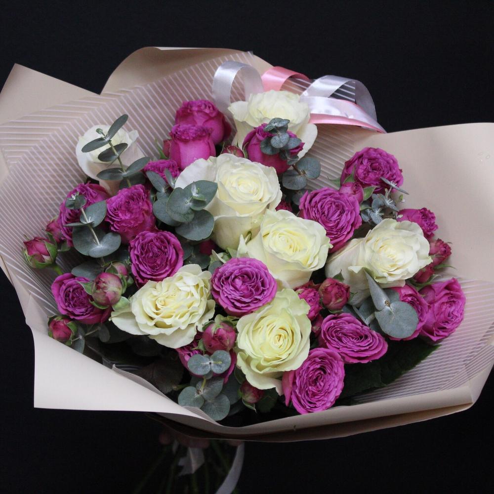 Роза Эквадор Премиум – 7 шт.роза пионовидная кустовая классик сенсейшн – 5 шт.Эвкалипт Baby Blue – 5 шт.Пленка матовая – 4 шт.Лента атласная – 2 шт.