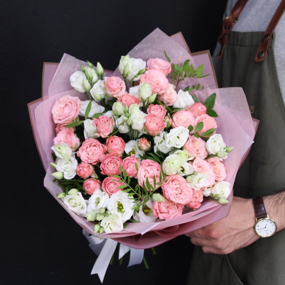 Эустома – 7 шт.Роза кустовая пионовидная мадам бомбастик – 10 шт.Фисташка – 2 шт.Тишью – 2 шт.Пленка дизайнерская – 2 шт.Лента атласная – 2 шт.