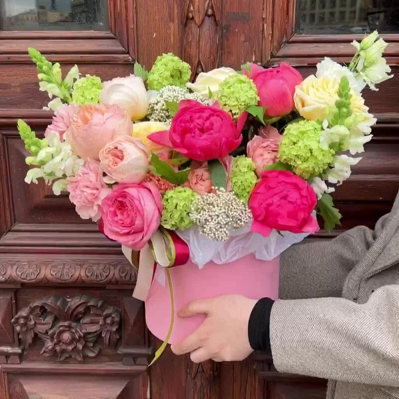 Вибурнум – 2 шт.Озотамнус – 2 шт.Лента атласная – 2 шт.Тишью – 1 шт.Диантус – 3 шт.Коробка шляпная – 1 шт.Роза остина пионовидная – 2 шт.Оазис флористический – 1 шт.Эустома белая махровая – 1 шт.джульетта роза пионовидная – 1 шт.Пион коралл шарм – 3 шт.антиринум – 3 шт.роза кэндллайт – 3 шт.