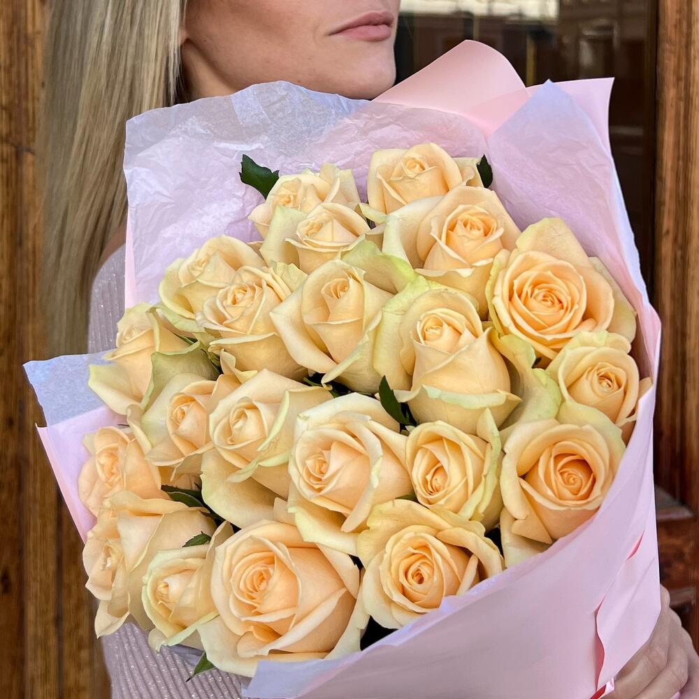 роза персиковая 60 см – 19 шт.Тишью – 1 шт.Дизайнерская упаковка – 3 шт.Лента атласная – 1 шт.