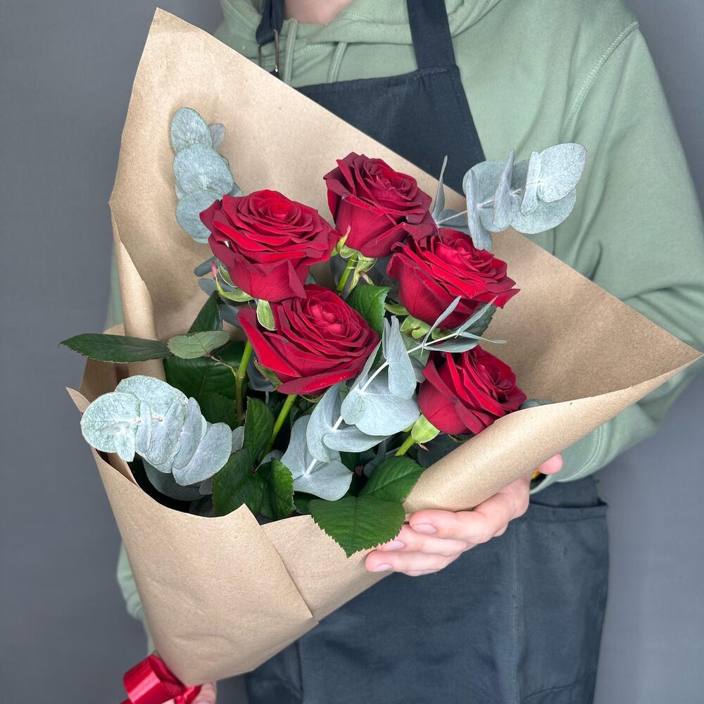 Букет из красных роз и ароматного эвкалипта