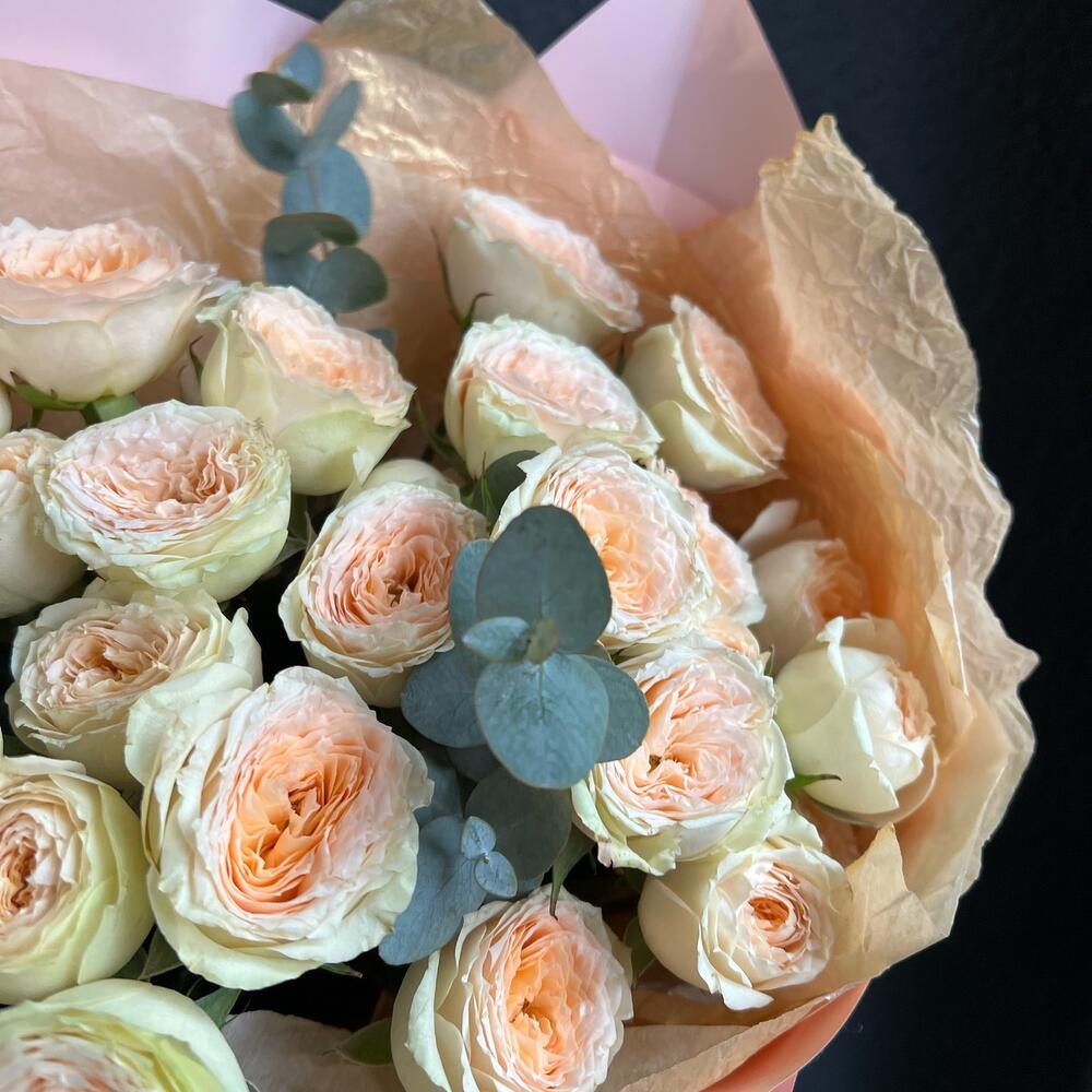 Кустовая роза – 7 шт.Эвкалипт – 5 шт.декоративная упаковка – 1 шт.Атласная лента – 1 шт.