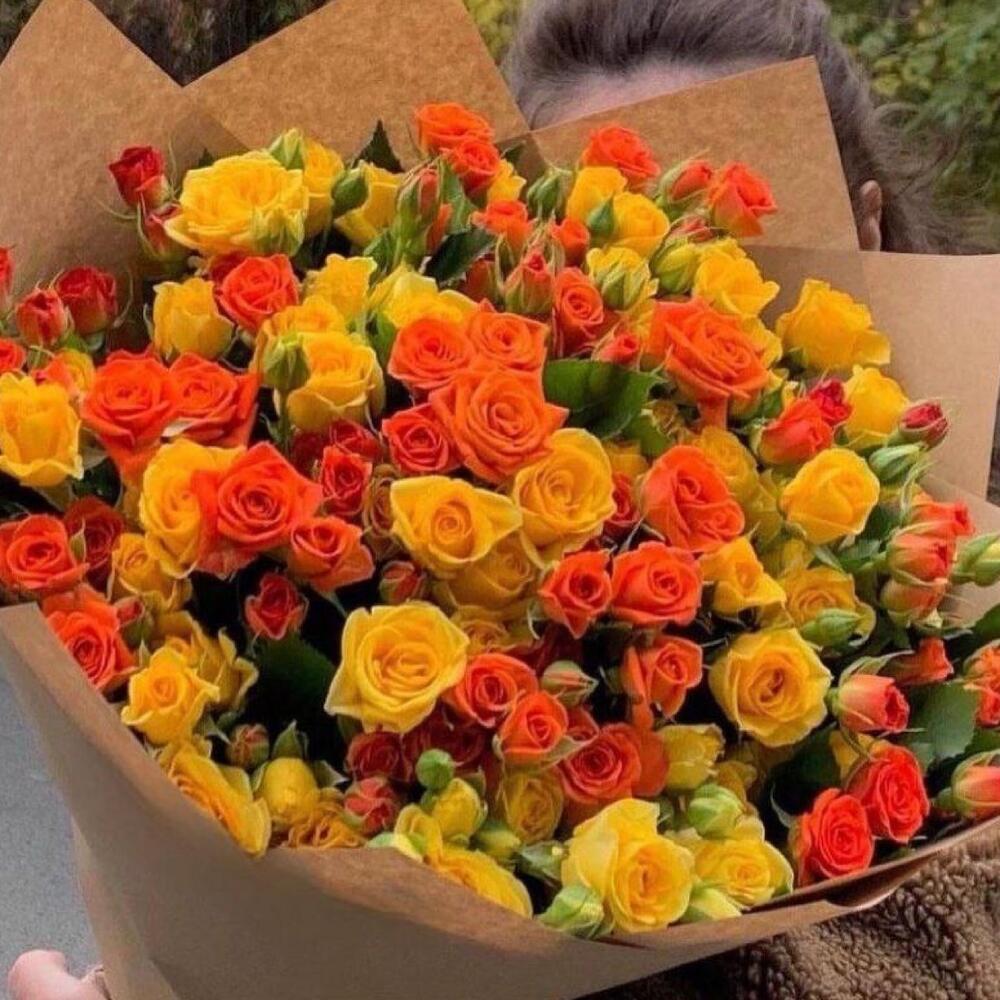 Роза кустовая – 51 шт.Упаковка дизайнерская – 1 шт.Лента атласная – 2 шт.Открыточка с вашими пожеланиями – 1 шт.хорошее настроение – 100 шт.инструкция по уходу за цветами – 1 шт.коробка переноска – 1 шт.Кризал – 1 шт.