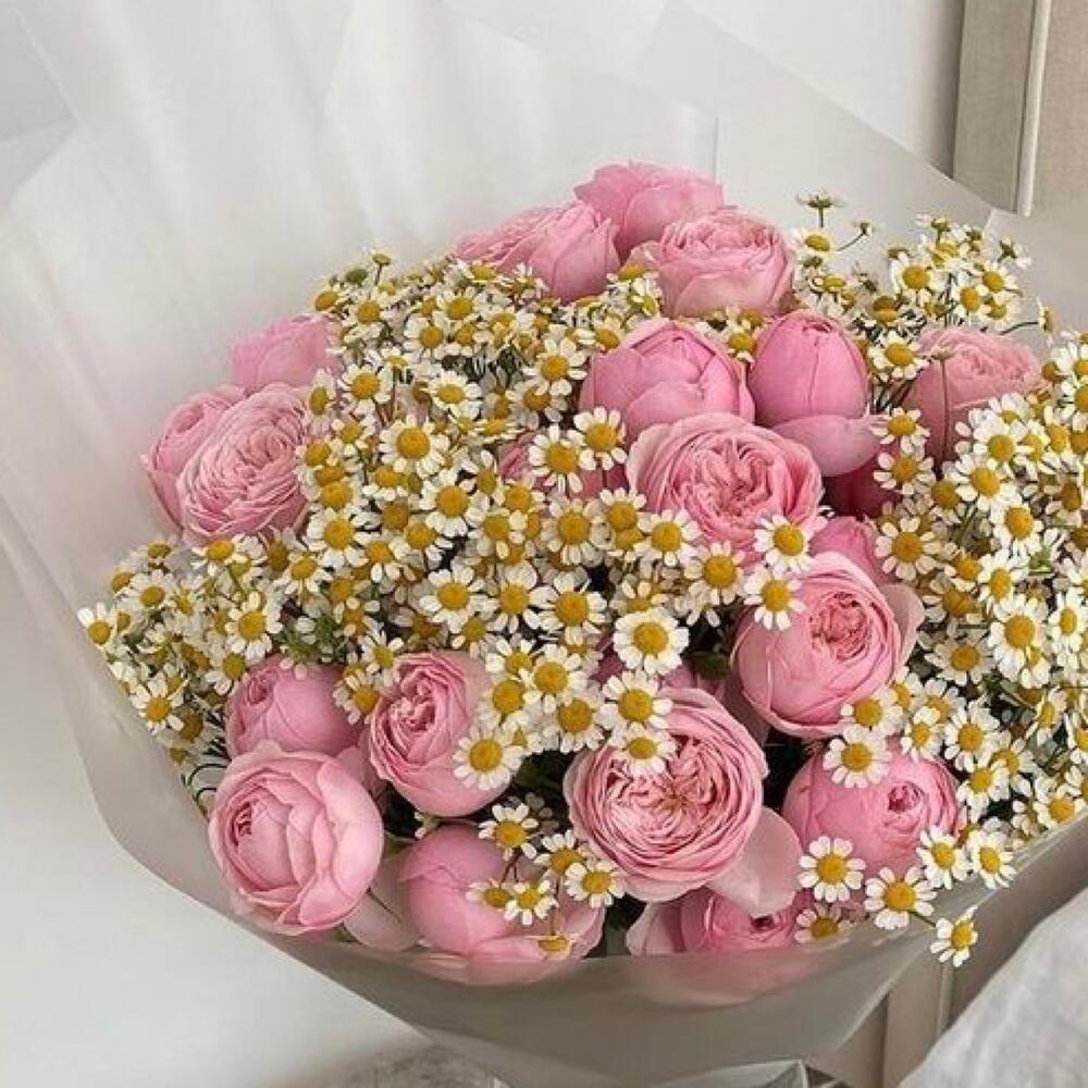 Букет из розовых пионовидных роз и ромашек