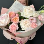 Эустома – 1 шт.Диантус – 2 шт.Фисташка – 3 шт.Пионовидная кустовая роза julliet – 1 шт.Дизайнерская упаковка – 3 шт.пионовидная роза white o’hara – 3 шт.
