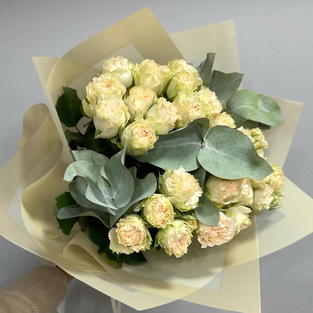 Эвкалипт – 1 шт. Кустовая пионовидная роза – 7 шт. Авторская упаковка – 1 шт.