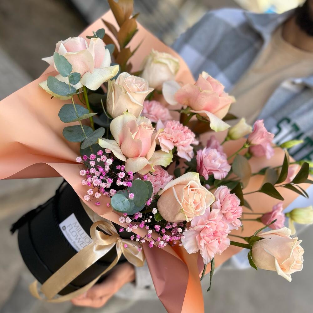 Гвоздики, Кустовые розы, Лизиантусы, Пионовидные розы, Розы
