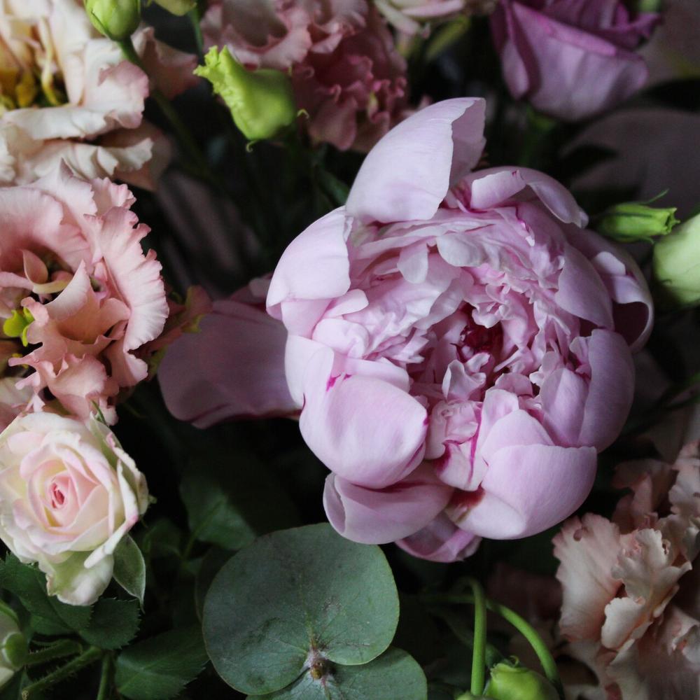 Пион Сара Бернар – 3 шт.Эустома – 7 шт.Эвкалипт – 3 шт.Тишью – 1 шт.Оазис флористический – 1 шт.Коробка шляпная – 1 шт.Роза кустовая – 3 шт.