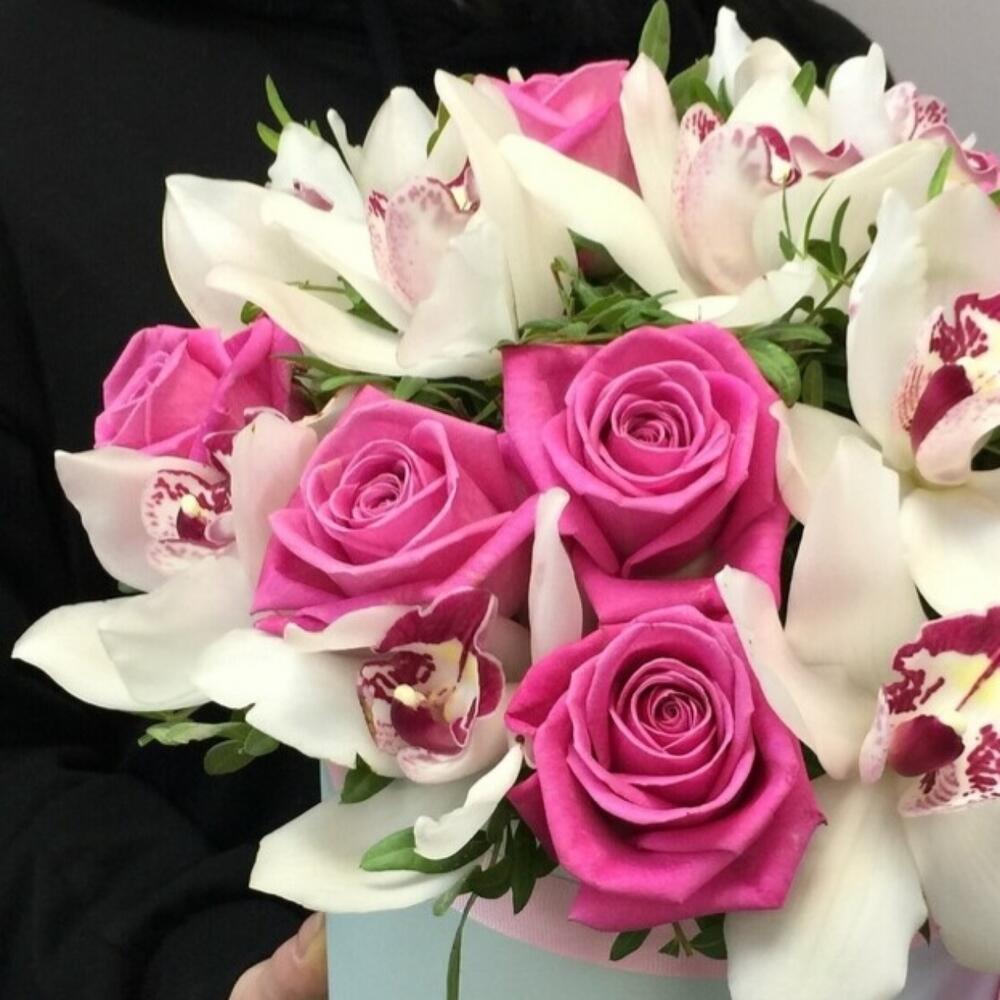 Орхидея Цимбидиум – 10 шт.Роза – 11 шт.Лента атласная – 1 шт.Шляпная коробка – 1 шт.Губка флористическая – 2 шт.зелень декоративная – 4 шт.
