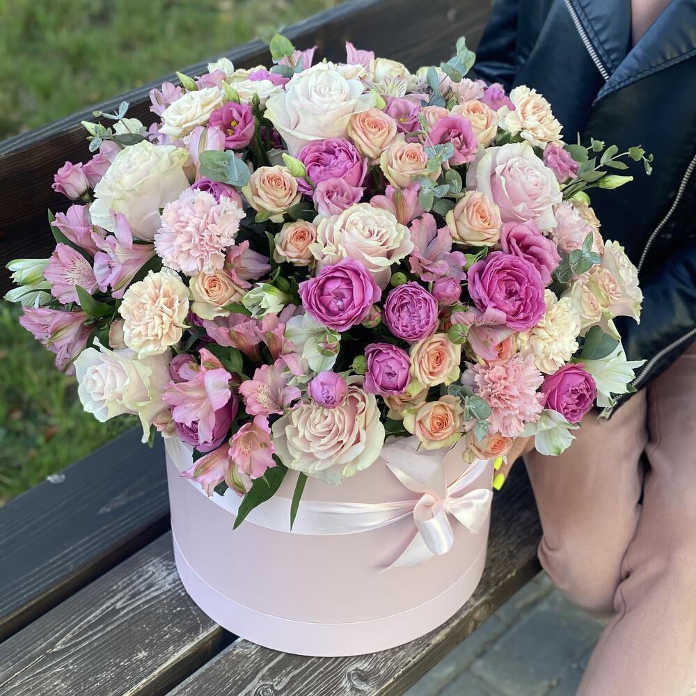 Коробка – 1 шт. Оазис – 4 шт. Эустома – 6 шт. Роза розовая – 10 шт. Эвкалипт – 4 шт. Кустовая роза – 18 шт. Гвоздика сортовая – 10 шт. Альстромерия – 13 шт. Оформление – 1 шт.