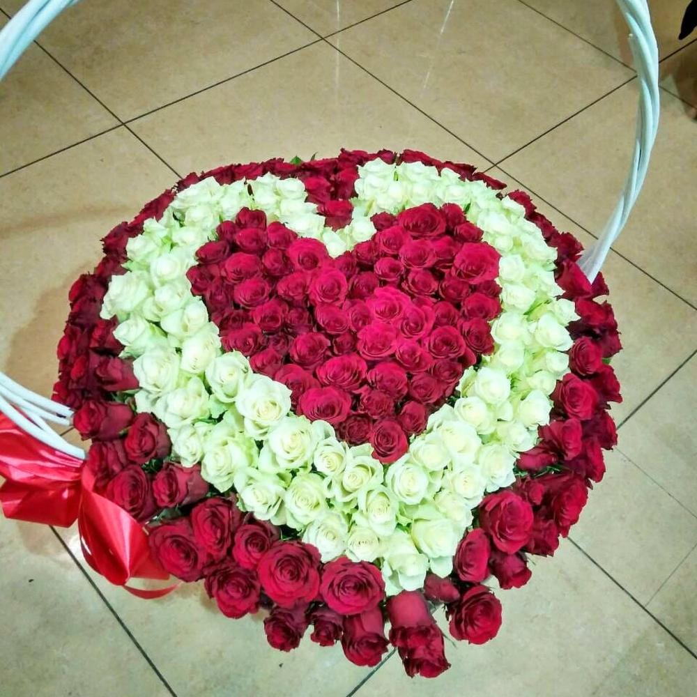 Роза красная – 150 шт.Роза белая – 51 шт.Корзина большая – 1 шт.