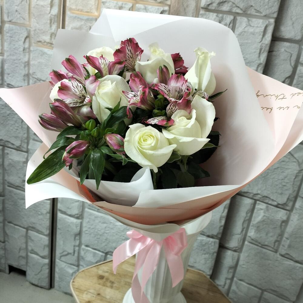Упаковка – 2 млЛента атласная – 1 шт.Альстромерия Микс Европа – 3 шт.роза 65 см – 7 шт.