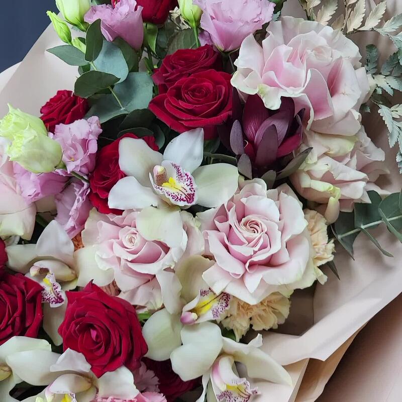 левкадендрон – 3 шт.Лизиантус – 5 шт.Орхидея Цимбидиум – 6 шт.Папоротник – 3 шт.Эвкалипт – 5 шт.Роза – 9 шт.Роза Эквадор – 6 шт.Гвоздика – 5 шт.Фисташка – 7 шт.Упаковка дизайнерская – 1 шт.