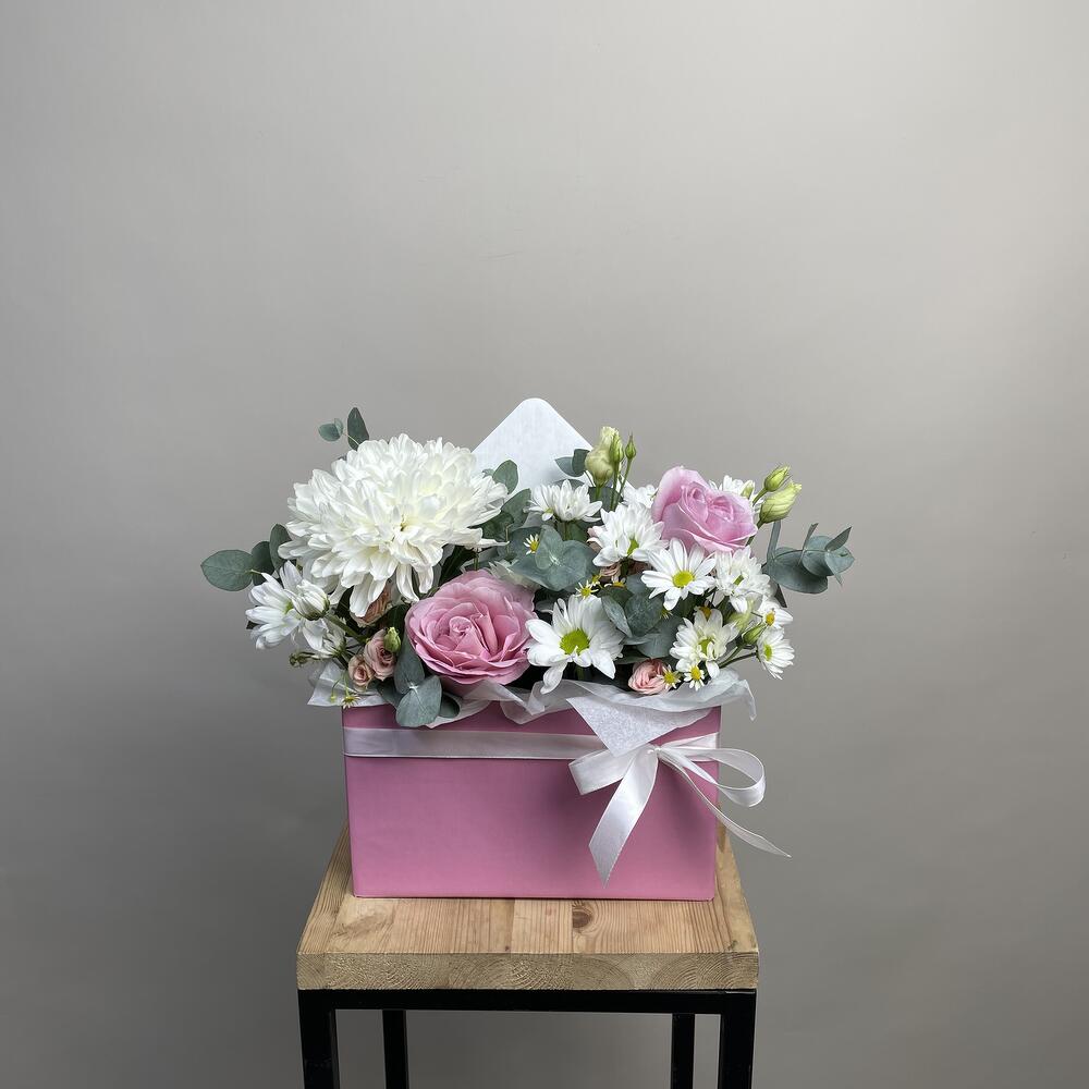 "Атлас☁️" - цветочная композиция с зефиром в деревянном ящике