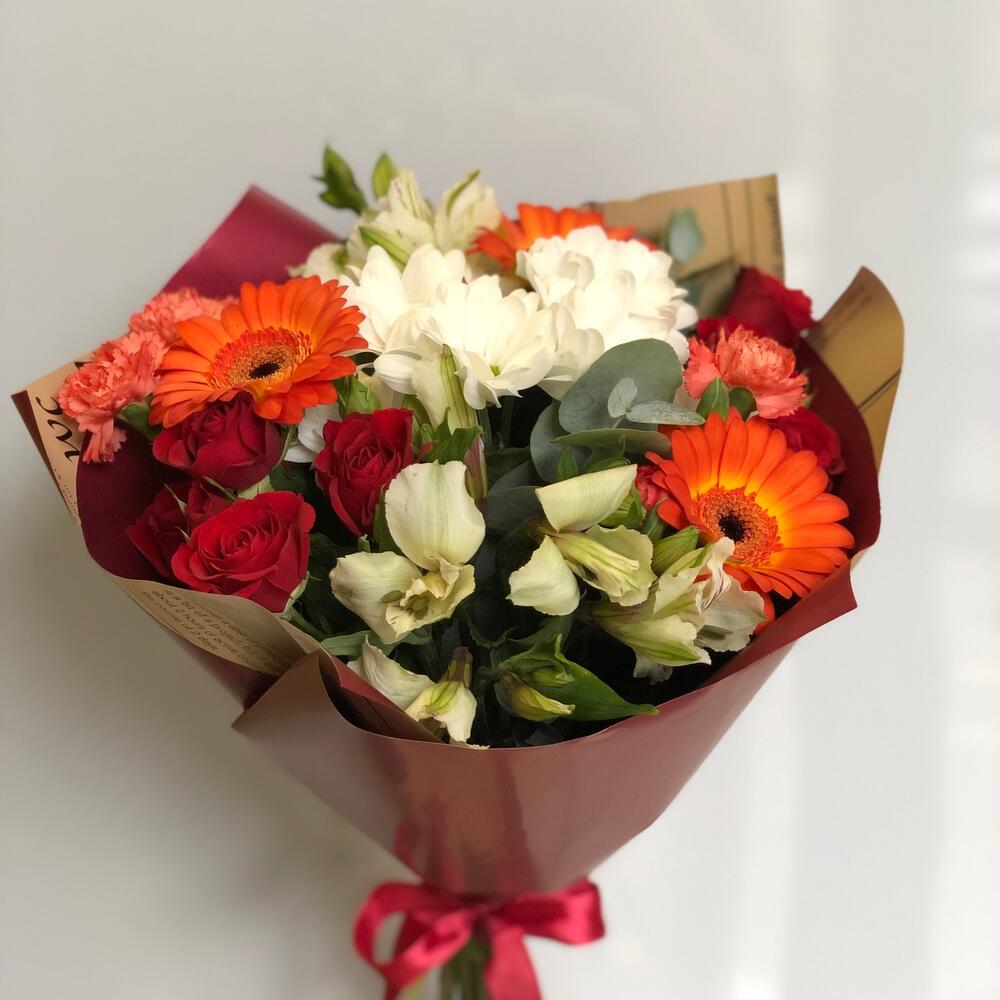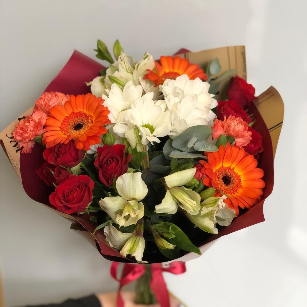 Хризантема кустовая – 1 шт.Гермини – 3 шт.Альстромерия – 2 шт.Роза кустовая – 2 шт.Гвоздика кустовая – 2 шт.Эвкалипт – 1 шт.Авторская упаковка – 1 шт.Лента атласная – 1 шт.