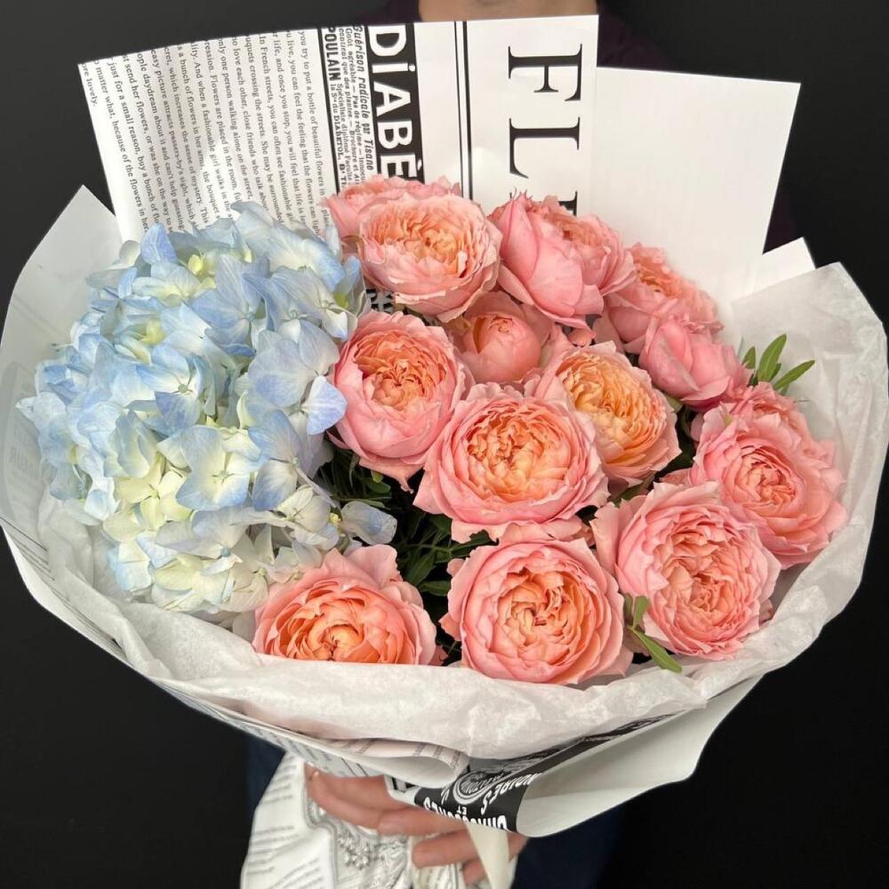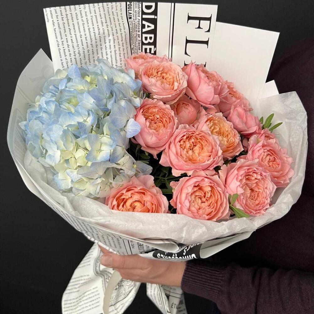 Альстромерии, Кустовые розы, Лизиантусы, Пионовидные розы, Розы, Ромашки