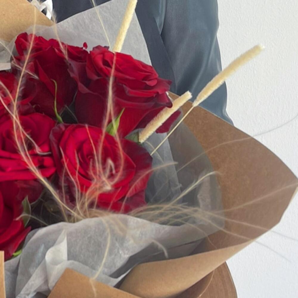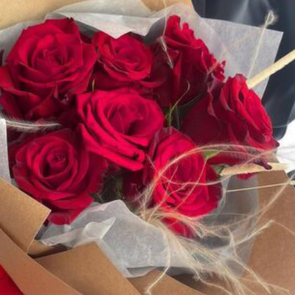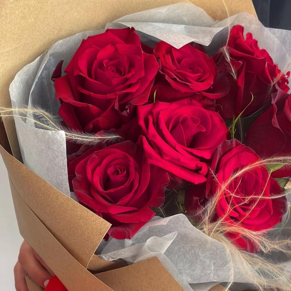 Роза – 7 шт.Лента атласная – 3 шт.Крафт – 3 шт.стифа пучок – 1 шт.