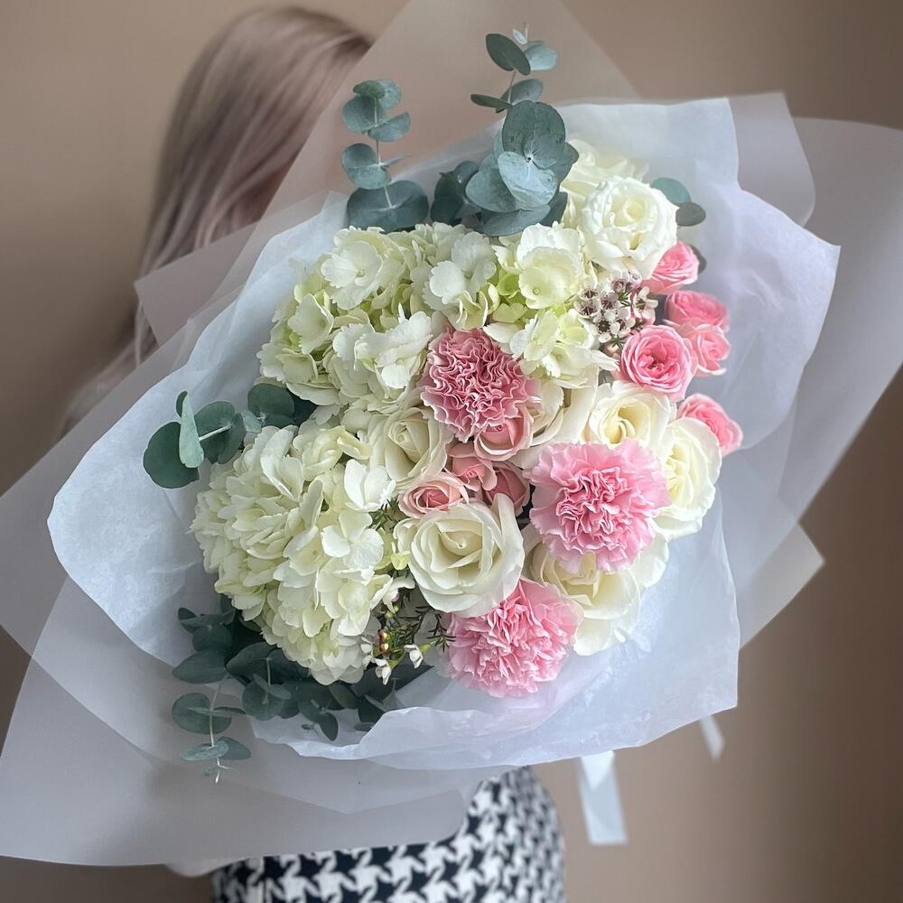 “Эвкалиптическая роскошь” гортензия и пионовидная кустовая роза