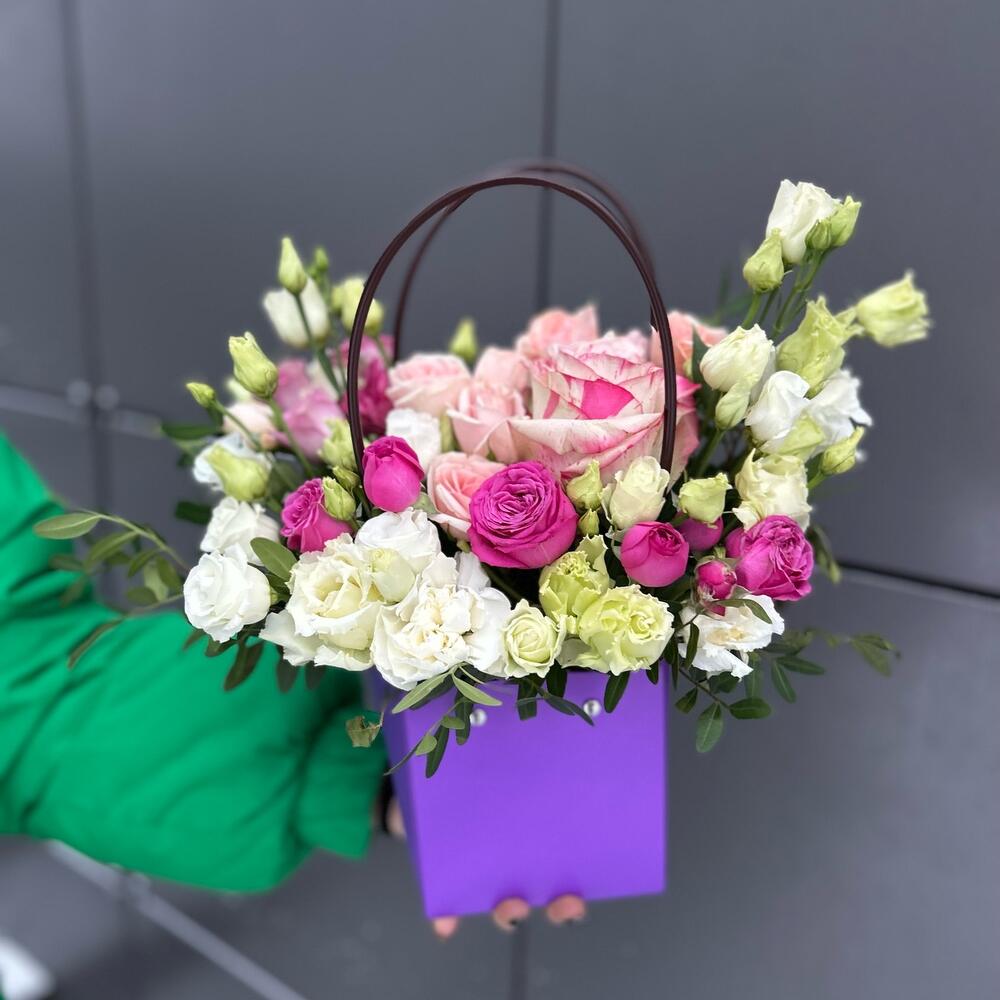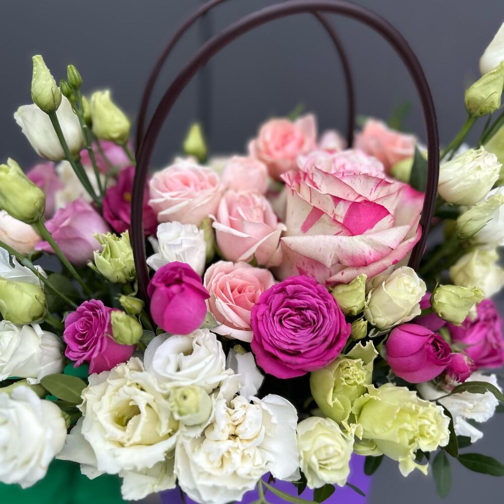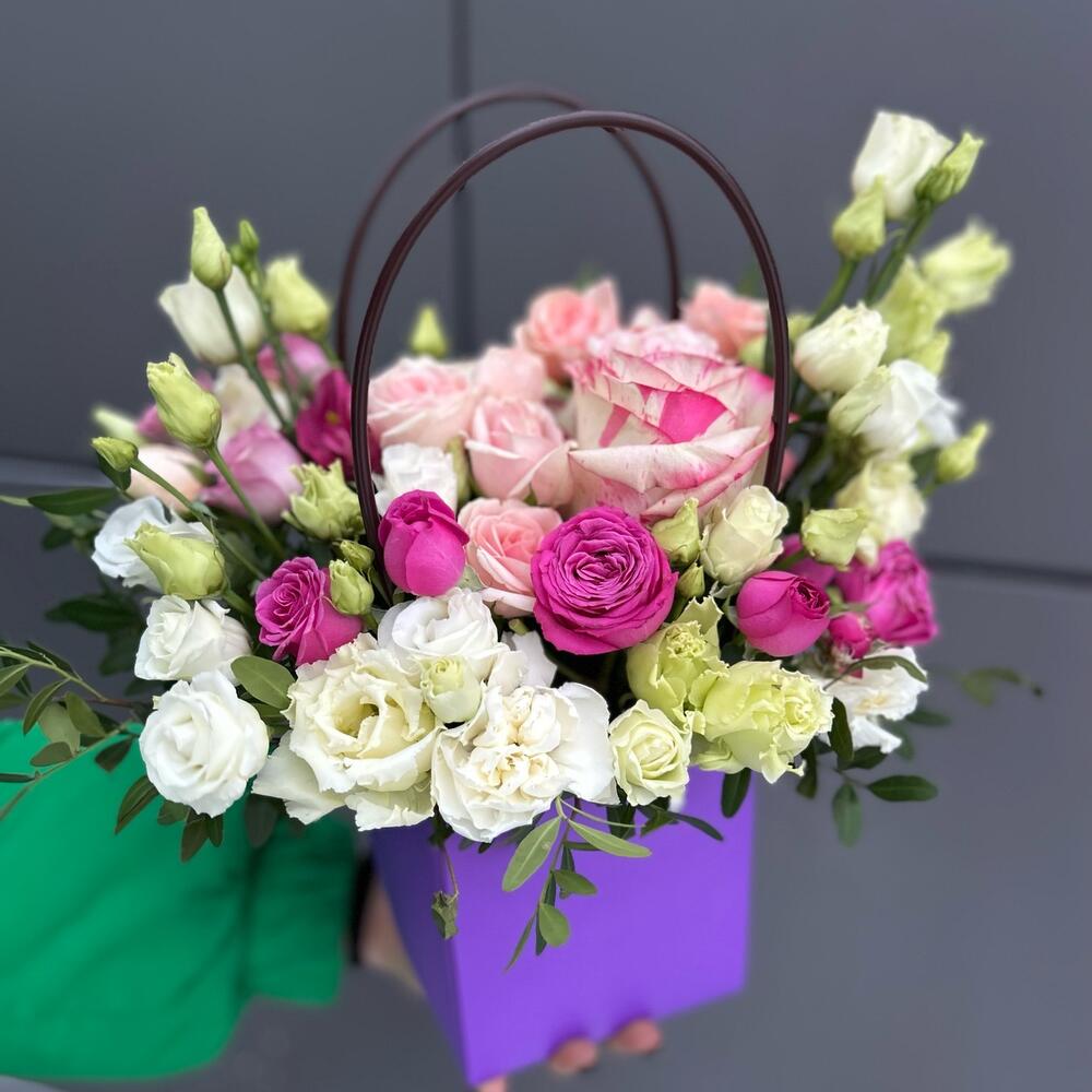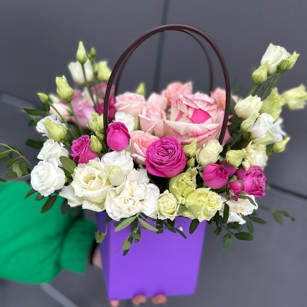 Эустома – 2 шт. Роза Эквадор – 1 шт. Кустовая роза – 3 шт. Фисташка – 3 шт. Флористическая губка – 1 шт.