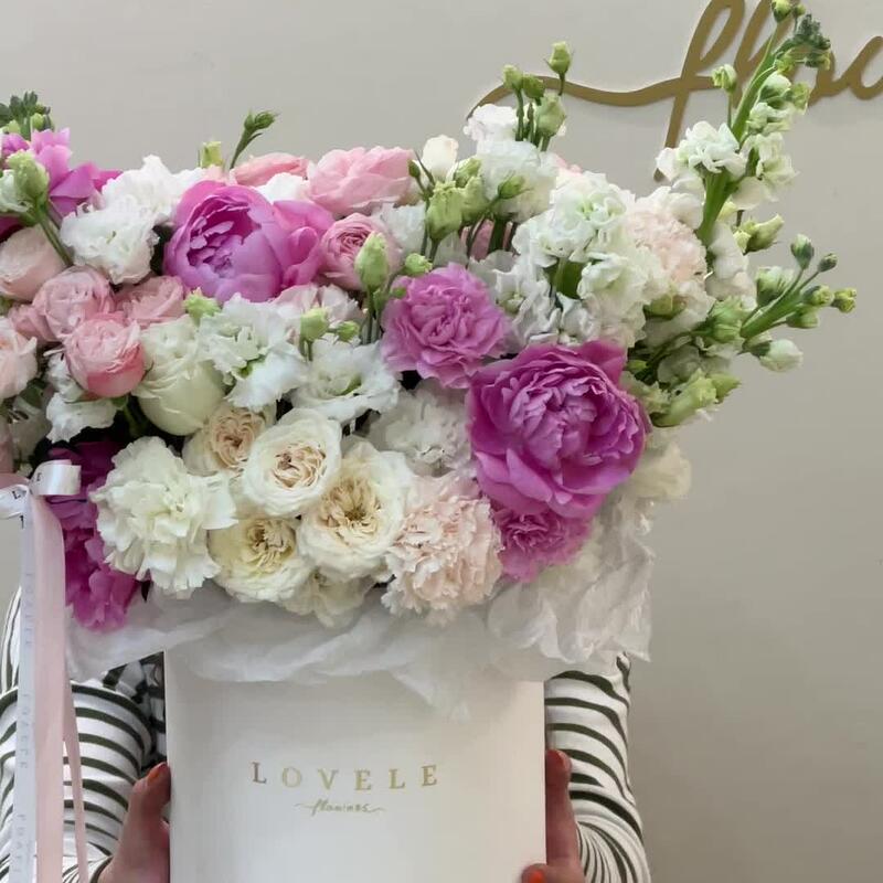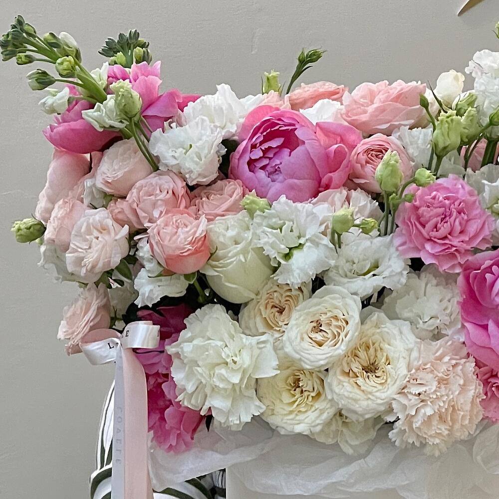 Роза кустовая белая – 2 шт.Роза кустовая пионовидная – 9 шт.Пион розовый – 5 шт.Маттиола – 5 шт.Роза белая пионовидная – 3 шт.ранцнкулюс – 2 шт.Гвоздика – 15 шт.Эустома – 7 шт.коробка большая брендированнвя – 1 шт.Лента атласная – 2 шт.Упаковка тишью – 3 шт.Оазис флористический – 1 шт.