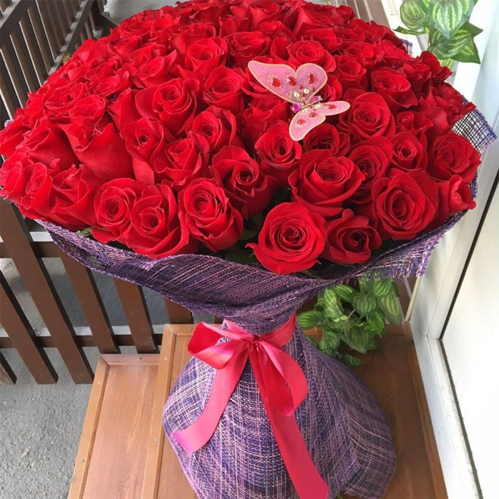 Роза фридом 100 см – 101 шт. Упаковка Джут – 1 шт. Лента шелковая – 1 шт. Декоративная бабочка – 1 шт.