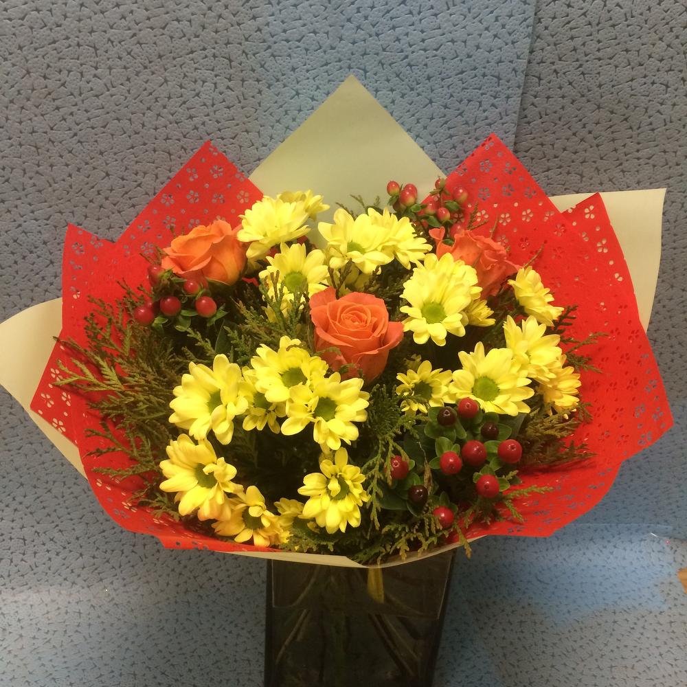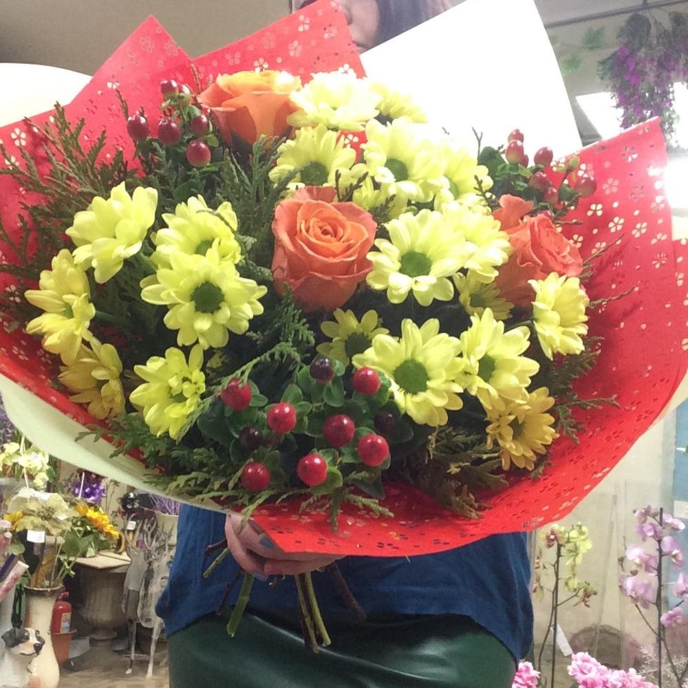 Роза – 3 шт.Хризантема кустовая – 3 шт.Гиперикум – 3 шт.Зелень – 15 шт.Упаковка – 1 шт.