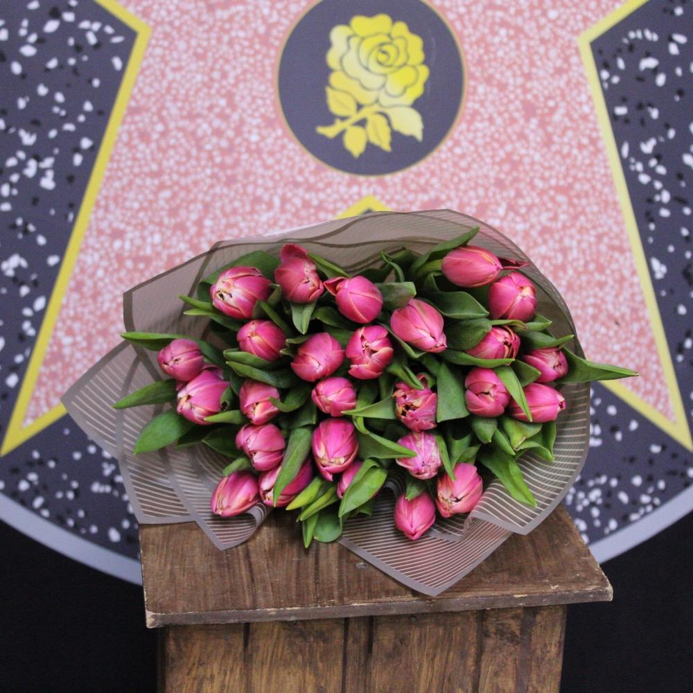 тюльпан пионовидный коламбус – 25 шт.Пленка дизайнерская – 2 шт.Лента атласная – 1 шт.