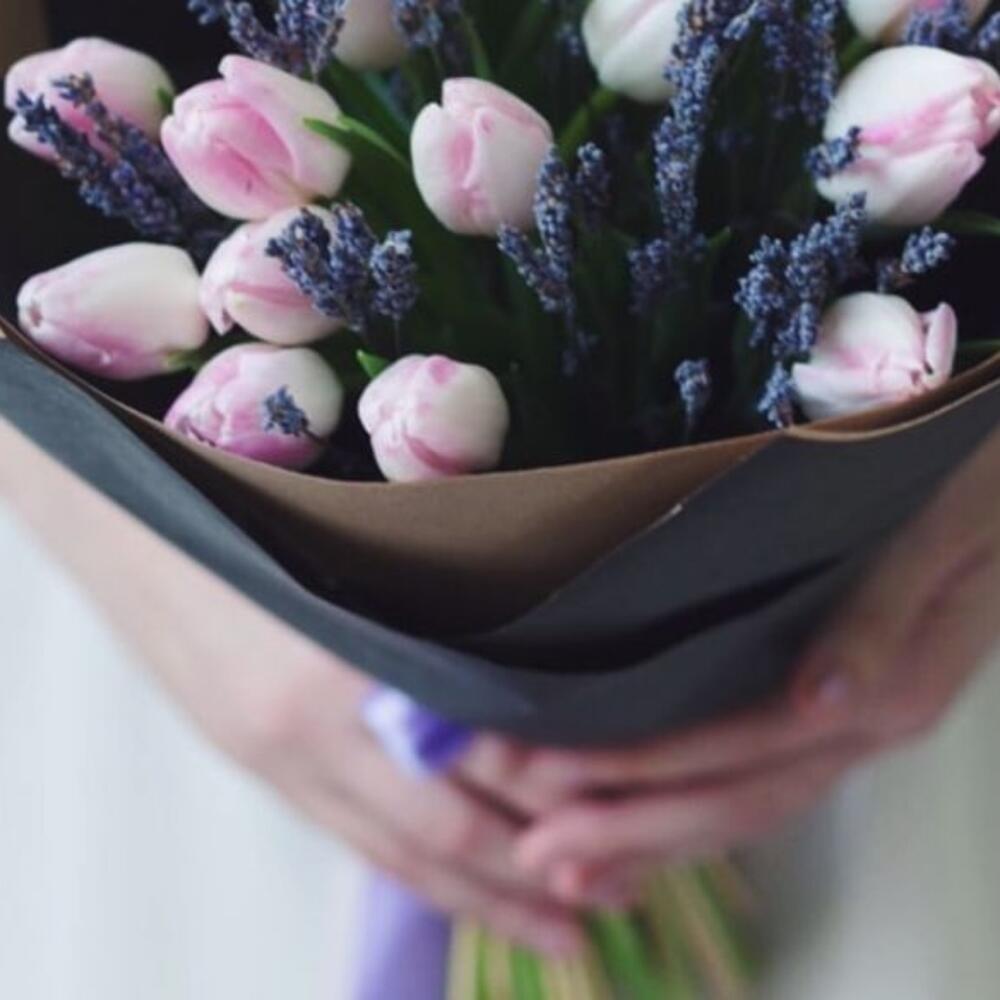 Роскошный букет из нежно розовых тюльпанов и ароматной горной лаванды в крафте . Всё цветы в букете очень стойкие , поэтому будут радовать вас очень долгое время . Аромат весны наполнит вас отличным настроением . )